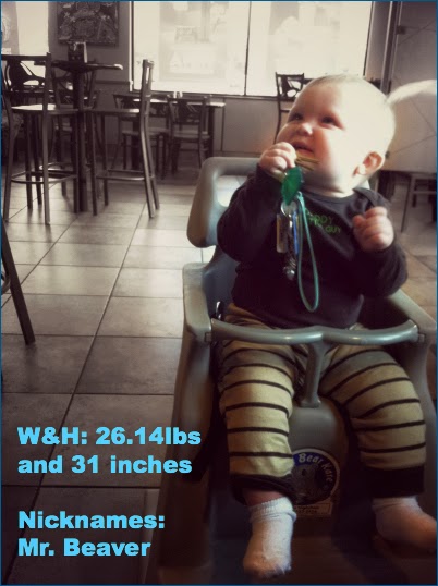 So I tried taking his picture on October 6th (because I like to use those pics for his stat information, but boy was he not having it that morning!). He seemed ready to battle it out, just sitting in Taco Bell (his first time there), but at least he seemed to enjoy the food (when he wasn't practicing his karate moves) :) The next day, we went to Baby Storytime, but for the last two months - he only seems to enjoy books, when he can eat them. Hence, the nickname of Mr. Beaver still holding strong this month, too!